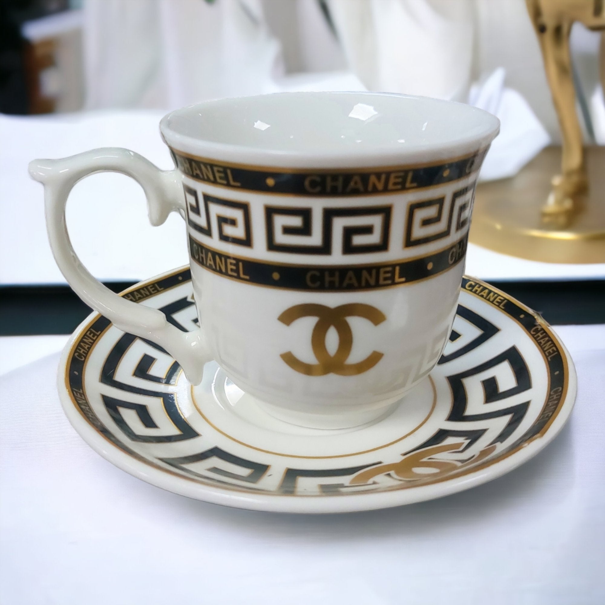 🍷 Elegantan Dizajn za Užitak: Uživajte u svakom gutljaju s prekrasnim Chanel uzorkom u bijeloj, zlatnoj i crnoj boji za nenametljivu sofisticiranost.