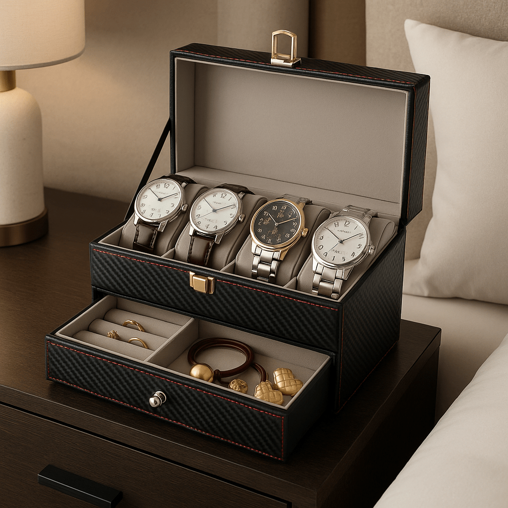 Otkrijte savršen spoj luksuza i praktičnosti uz ovu elegantnu kutiju za satove i nakit – vaša kolekcija zaslužuje najbolje!